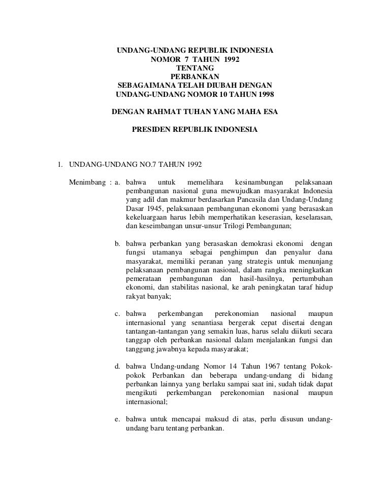 Undang Undang Nomor 7 Tahun 1992 Tentang Perbankan Sebagaimana Diubah